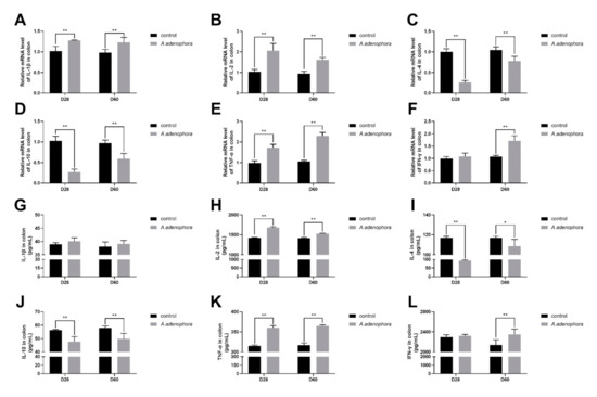 The mRNA expression in the rectal tissues of rats fed A. adenophora showed that the pro-inflammation cytokines (IL-1β, IL-2, TNF-α, and IFN-ϒ) were elevated, whereas the anti-inflammatory cytokines (IL-4 and IL-10) decreased in the treatment groups compared with the control group at all timepoints (p < 0.01, Figure 11A–F). Similar trends were observed with the protein expression results; however, no difference occurred with cytokines IL-1β (at D28 and D60), IL-10 (at D28 and D60), and IFN-ϒ (at D60) (p > 0.01 or p > 0.05, Figure 11G–L).