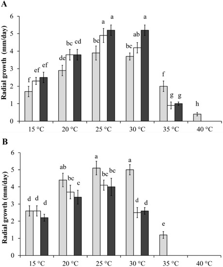 Daily radial growth of F. proliferatum and F. subglutinans isolates grown at different temperatures from 15 °C to 40 °C: (A) F. proliferatum isolates PRO1 (light grey bars), PRO2 (white bars), and PRO3 (dark grey bars); and (B) F. subglutinans isolates SUB1 (light grey bars), SUB2 (white bars), and SUB3 (dark grey bars). Values (mm ± SE; standard error) with different letters in columns are significantly different (p < 0.05), based on ANOVA and Tukey’s HSD tests. Statistical analyses were performed separately per species.
