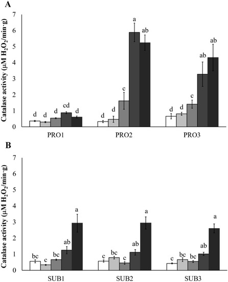 Catalase activity of F. proliferatum ((A); PRO1, PRO2, and PRO3) and F. subglutinans ((B); SUB1, SUB2, and SUB3) isolates at different H2O2 concentrations after H2O2 treatment (untreated control, white bar; 1 mM, light gray bar; 2 mM, grey bar; 5 mM, dark grey bar; and 10 mM, black bar). Activity is expressed as micromoles of H2O2 consumed per minute per gram of dry fungal biomass. Bars ± SE (Standard Error) with different letters are significantly different (p < 0.05), based on ANOVA and Tukey’s HSD tests.
