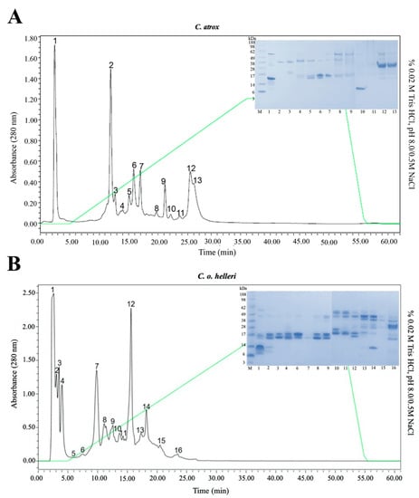 Crude venom from C. atrox and C. o. helleri was fractionated by anion exchange DEAE chromatography. A total of 200 µL (8 mg) was fractioned using a WATERS™ Protein-Pak™ DEAE 5PW column (7.5 × 75 mm) (Milford, MA, USA). The column was equilibrated with 0.02 M Tris-HCl buffer, pH 8.0, and the fractions were eluted using 0.02 M Tris-HCl buffer containing 0.5 M NaCl, pH 8.0 over a period of 60 min with a flow rate of 1 mL/min. Eluted proteins were collected in 15 mL tubes, and a Breeze2 computer software system was used to generate the chromatogram. The absorbances of the fractions were read at 280 nm, and the tubes containing the fractions were stored at −20 °C until further use.
