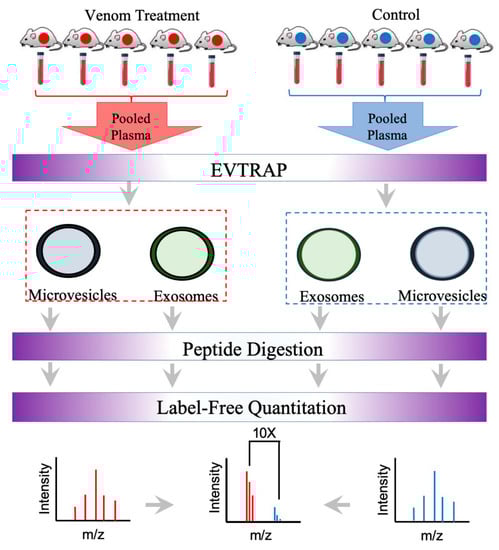 Currently, the identification, composition, and role of circulating extracellular vesicles in snake bite envenomation victims remain unknown. Circulating extracellular vesicles have been reported in hemostatic disorders and pathophysiological thrombosis from the analysis of several cell-derived extracellular vesicles found in systemic circulation (such as red blood cells, platelets, leukocytes, and endothelial cells) [17]. Snake bite envenomation often results in mild to severe coagulopathy and alterations of physiological hemostasis and thrombosis [45,46], raising the possibility of circulating extracellular vesicles being present in victims. In order to address this question, as well as exploit the cellular features and capability of extracellular vesicles to harbor acute or chronic biomarkers of disease, EVtrap was utilized for the identification and quantification of biomarkers from EVs in plasma samples taken after snake bite envenomation. Exosomes derived from BALB/c mice treated with a sublethal dose of C. atrox and C. o. helleri crude venoms and purified via EVtrap were analyzed in a discovery-based initial screen to explore the venom-reactome following the proteomic workflow depicted in Figure 5.