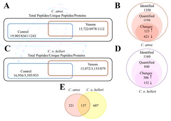 Schematic representation of the proteomic data form all experimental conditions. (A) Total proteins and peptides from C. atrox proteomic dataset. (B) Changes identified from label-free quantification in C. atrox dataset. (C) Total proteins and peptides from C. o. helleri proteomic dataset. (D) Changes identified from label-free quantification in C. o. helleri dataset. (E) The overlap of protein found between both snake envenomation C. atrox and C. o. helleri datasets.