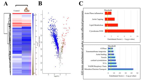 (A) The heat map of normalized abundances for differentially expressed proteins from plasma EVs between control sample of mice injected with PBS and mice injected with C. atrox venom. (B) Volcano plots showing the statistically differentially expressed proteins (t-test; FDR 0.05). The red represents a fold change greater than 0.1 and is considered upregulated, the blue represents a fold change of less than −0.5 and is considered downregulated, and the grey is unregulated proteins. (C) Gene ontology term enrichment of affected processes; the chart in red represents the most affected upregulated processes, and the bottom chart in blue represents the most affected downregulated processes.