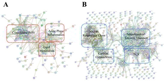 Analysis of protein–protein interactions (PPIs) against the STRING database for (A) upregulated proteins and (B) downregulated proteins from plasma EVs of mice injected with C. atrox venom.