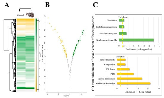 (A) The heat map of normalized abundances for differentially expressed proteins from plasma EVs between control sample of mice injected with PBS and mice injected with C. o. helleri venom. (B) Volcano plots showing the statistically differentially expressed proteins (t-test; FDR 0.05). The green represents a fold change greater than 0.1 and is considered upregulated, the yellow represents a fold change of less than −0.5 and is considered downregulated, and the grey is unregulated proteins. (C) Gene ontology term enrichment of affected processes; the chart in green represents the most affected upregulated processes, and the bottom chart in yellow represents the most affected downregulated processes.