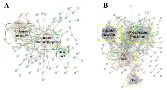 Analysis of protein–protein interactions (PPIs) against the STRING database for (A) upregulated proteins and (B) downregulated proteins plasma EVs of mice injected with C. o. helleri venom.