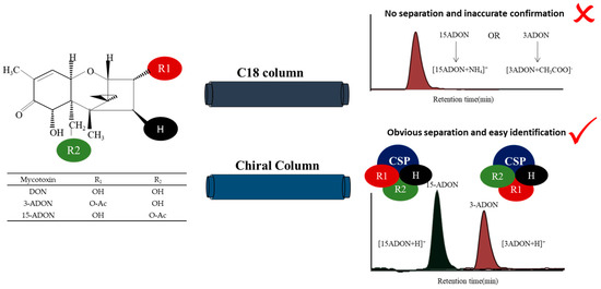 Principle required for the chiral separation of deoxynivalenol (DON), 3-acetyldeoxynivalenol (3-ADON) and 15-acetyldeoxynivalenol (15-ADON).