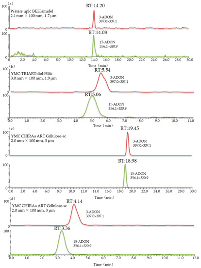 LC-MS/MS chromatograms of wheat blank samples spiked with 3-ADON and 15-ADON using different columns: (a) waters UPLC BEH amidel (2.1 mm × 100 mm, 1.7 μm); (b) YMC-TRIART diol-HILIC (3.0 mm × 100 mm, 1.9 μm); (c) YMC CHIRAa ART Cellulose-sc (2.0 mm × 100 mm, 3 μm); (d) YMC CHIRAa ART Cellulose-sc (2.0 mm × 100 mm, 3 μm). Eluent A: 5 mM ammonium acetate; eluent B: methanol.