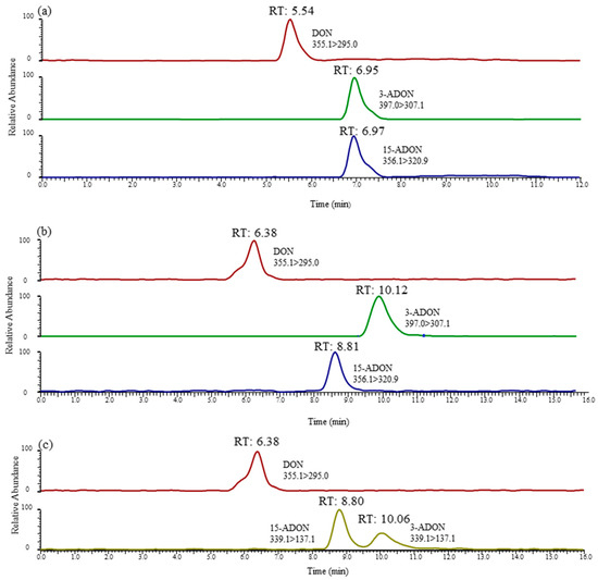 LC-MS/MS chromatograms of DON, 3-ADON and 15-ADON in method A (a), method B (b) and method C (c). DON and 3-ADON had a concentration of 8 ng/mL, and 15-ADON had a concentration of 16 ng/mL.