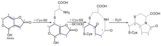 Michael addition reaction between patulin (PAT) and cysteine (CYS) suggested by Fliege and Metzler [14].