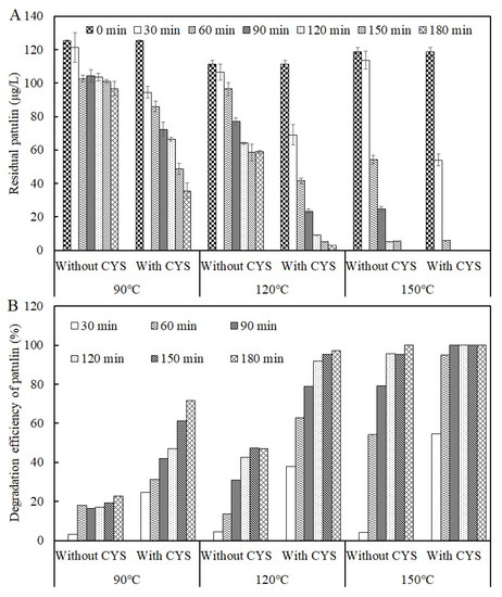 Residual concentrations (A) and degradation efficiencies (B) of patulin in pH 3.5 of solutions with and without cysteine at different temperatures (90–150 °C) (Supplementary Data S1).