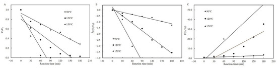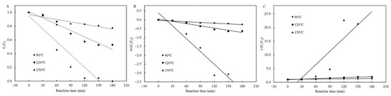 Plots of the zero- (A), first- (B), and second-order (C) kinetic models for patulin degradation in pH 3.5 of solutions with cysteine at different temperatures (90–150 °C) (Supplementary Data S1).