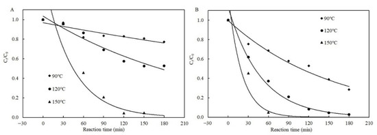 Figure 5 illustrates the fitted curves of the Weibull models to the data for degradation of patulin with and without cysteine in pH 3.5 of PCA buffer solutions. The degradation efficiency of patulin in the presence of cysteine at different temperatures complied well with the Weibull model due to the non-linear decrease in Ct/C0 with the reaction time (R2 = 0.9297–0.9910) (Figure 5B and Table 3). The degradation efficiency of patulin without cysteine also followed the Weibull model at 120 and 150 °C (R2 = 0.9227–0.9450) (Figure 5A and Table 3). The kT increased with the increase in temperature ranging from 90 to 150 °C.