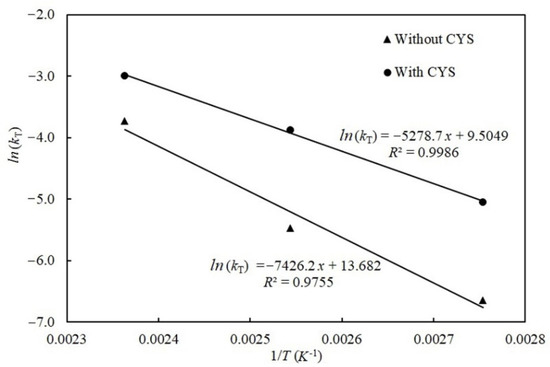 Figure 6 depicts the degradation of patulin without and with cysteine based on the Arrhenius equation at different temperatures. Seen from the Figure 6, the relationship between ln(kT) and the inverse of the absolute temperature (1/T) were highly linear (R2 = 0.9755 without cysteine and 0.9986 with cysteine), respectively, which showed an Arrhenius-type temperature dependency for both reactions. The shape parameter n = 1, which remained with increasing temperature, indicating the reaction mechanism between patulin and cysteine, was not affected by temperature. According to Equation (7), the calculated activation energies (Ea) for the degradation of patulin without and with cysteine were 61.74 kJ/mol and 43.89 kJ/mol, respectively.