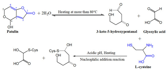 It is well known that patulin is an unsaturated γ-lactone, which can react with L-cysteine based on the Michael addition reaction, a nucleophilic addition reaction, and form PAT-CYS adducts [13,14]. The toxicities of these adducts are significantly lower than that of patulin itself [15,16]. However, the Michael addition reaction (a nucleophilic addition reaction) is carried out spontaneously under weak-acidic or near-neutral conditions (pH 6.0–7.4) [14,16]. The pH value of apple juice ranges from 3.0 to 4.0, so it is difficult to form the PAT-CYS adducts based on the Michael addition reaction between patulin and cysteine under highly acidic conditions (pH < 6.0). In this study, cysteine still effectively degraded patulin in highly acidic conditions (pH 3.5) at temperatures greater than 90 °C, while the degradation mechanisms of patulin by cysteine were still unknown. However, we can infer that there are three possible mechanisms leading to the effective degradation of patulin by cysteine under high acid and high temperature based on the reported literatures [14,25]. The first mechanism remains a nucleophilic addition reaction. Increasing the temperature significantly increases the motion speed of patulin and cysteine molecules in the solution, and then increases the chance for mutual collisions between the active sites (-SH, -NH2, and -COOH groups) of cysteine with patulin, thus facilitating the nucleophilic addition reaction between them [14]. The second one is the combination of thermal degradation and nucleophilic addition reaction. According to the previous research [25], patulin is firstly thermo-degraded to 3-keto-5-hydroxypentanal and glyoxylic acid at high temperatures (>80 °C), which might be a reversible process. Both products contain an aldehyde group with high activation and electrophilic properties, which can react with cysteine (nucleophilic agent) to form their adducts (Figure 7). The third is forming hydrogen bonds and covalent bonds between patulin and cysteine (-SH and -NH2 groups) in high-acid and high-temperature environments [27,28,29]. These inferred mechanisms should be further verified based on the analysis of Fourier transform infrared spectra (FTIR), mass spectroscopy (MS), nuclear magnetic resonance (NMR), and thin-layer chromatography (TLC) in the next work.