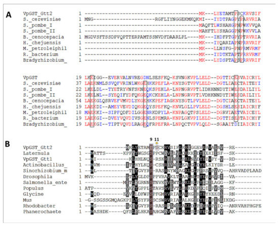Sequence alignments. (A) GST sequences using the atypical catalytic mechanism. The black boxes represent mechanistically conserved residues. (B) GST sequences that used Ser9 as a catalytic residue. The shaded box highlights the conserved Ser, which in VpGSTT2 was a Thr, with Ser11 (highlighted with a star) two residues further toward the C-terminus. The sequences were obtained from [5].