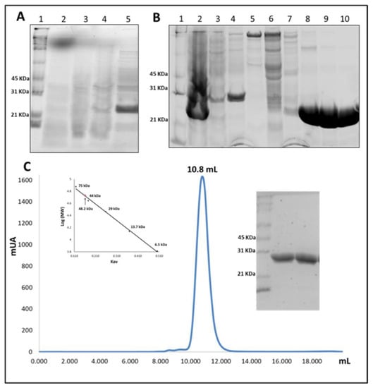 Purification of VpGSTT2. (A) SDS-PAGE of expression time points: lane 1 is the molecular weight marker (MWM); lanes 2–5 are samples from 0, 2, 4, and 24 h, respectively. The highest level of soluble VpGSTT2 (25 kDa) was found 24 h after induction. (B) SDS-PAGE IMAC purified fractions of VpGSTT2: lane 1, MWM; lane 2, clarified soluble cell extract; lanes 3–4, unbound protein; lanes 5–7, 75 mM imidazole eluate; lanes 8–10, 125 mM imidazole eluate containing VpGSTT2. (C) Gel filtration chromatogram showing VpGSTT2 eluting at 10.8 mL, corresponding to 48.2 kDa. SDS-PAGE (right) on samples obtained from the gel filtration experiment.