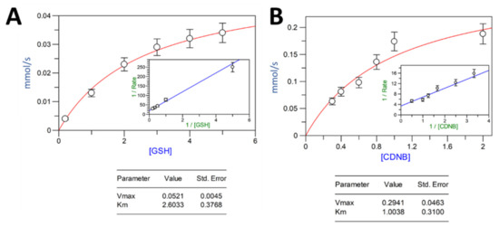 Michaelis–Menten plot for recombinant VpGSTT2: (A) GSH-varied; (B) CDNB-varied. Substrate concentrations are in mM.