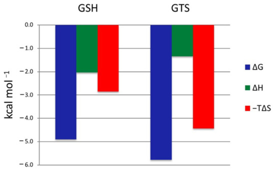 Freire diagram for the thermodynamic binding profile of VpGSTT2. The values of ΔG, ΔH, and −TΔS (kcal/mol) of the binding of VpGSTT2 with the GSH substrate (left) and the GTS inhibitor (right) are shown. Positive energy values are unfavorable for binding, while negative energy values reflect tighter binding to the enzyme.