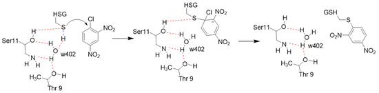 The S11A mutant retains 30% of wild-type activity, suggesting that the general base for deprotonating the glutathione sulfhydryl is likely to be the water molecule coordinated by Thr9 and Ser11. Therefore, the T9A/S11A double mutant was analyzed, since removing both residues to which the water molecule hydrogen bonds should eliminate it from the active site. The double mutant lacked detectable activity, which led us to conclude that water was the general base catalyst. Additionally, we hypothesized that Gtt2 class GSTs in general use a water molecule as the general base catalyst that activates GSH by deprotonation, increasing the nucleophilicity of the sulfhydryl such that it is able to form the Meisenheimer complex with CDNB (see Figure 9)