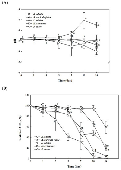 5.4. Time Course of Fungal Growth, Change in pH, and Removal of AFB1