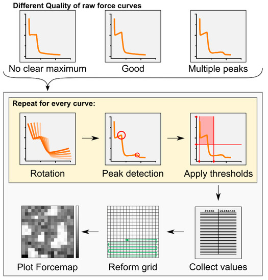Workflow of the Forcemap Analyser program. Detected force curves obtained by the force mapping tool of the AFM were processed by the Forcemap Analyser program to obtain a spatially reconstructed forcemap of the sample. For details see “Automatic force map analysis” in the Methods and Materials section.