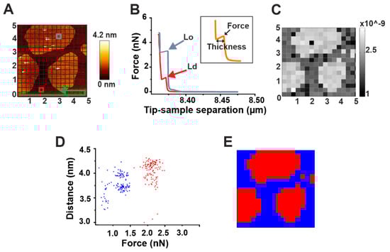 To solve this problem, we have developed an automatic processing tool (see Materials and Methods: Automatic force map analysis) that (i) allows for a fast, high-throughput analysis of force mapping data, thus drastically speeding up data analysis; and (ii) generates a spatial map of the acquired force values. Using this system, we were able to reconstruct the image of SM/Chol Lo domains in a DOPC Ld phase based on the different breakthrough force values characterizing the two phases (Figure 2B,C). In addition, we could provide fast information about their thickness and consequently on the difference in height between the two phases (height mismatch) (Table 2). Generally, distinct force spectroscopy information about force or thickness values in two phase systems have been obtained by manually selecting micro-areas containing exclusively one or the other phase and performing force spectroscopy in such areas [27]. Although possible, this can turn again in time-consuming measurements. To overcome this issue, we exploited the simultaneous force and thickness information provided by force mapping to perform a cluster analysis on our samples (Figure 2D,E).