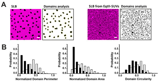Characterization of Lo domains imaged by confocal microscopy in the presence of EqtII. (A) Confocal images of SLB from SUVs not incubated (left panels) or incubated (right panels) with EqtII. Confocal images have been treated with the particle analysis tool of Imagej that allows the estimation of the perimeter, area, and circularity of the domains. The scale bar is 5 µm. (B) Comparison of the perimeter, area, and circularity of the domains without (white bars) and with (black bars) the protein. Histograms are normalized for better comparison (the number of points varies between 600 and 6500 from at least two independent experiments).