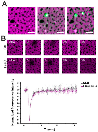 Confocal microscopy of DOPC/SM/Chol phases in the presence of FraC-488. (A) The Ld phase was stained with 0.1% DID (magenta) and FraCR126C was labelled with Alexa 488 (green). Picture taken immediately (left), 2 min (centre), and 15 min (right) after the addition of the protein. Scale bar is 5 µm. (B) Photobleaching experiments in the Ld phase without (black squares) and with (purple triangles) FraC. FraC does not alter the fluidity of the Ld phase. Dotted lines are for visual purposes only. Normalized fluorescence intensity over time is represented as the average ± SD over three (SLB) and six (FraC-SLB) repetitions.
