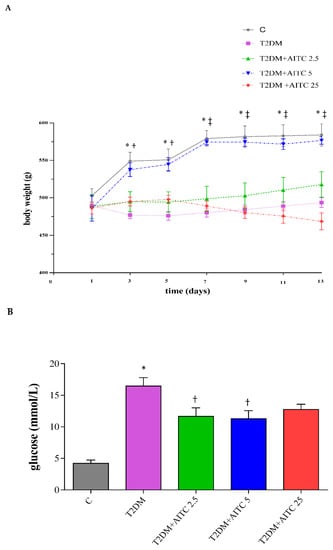 (A) Body weight gains of rats during experimental period (two-daily basis); Data are the mean ± SEM (n = 8). * p ≤ 0.01—significant difference between C and T2DM; † p ≤ 0.05—significant difference between T2DM and T2DM + AITC 5; ‡ p ≤ 0.01—significant difference between T2DM and T2DM + AITC 5. (B) The effect of AITC on glucose concentration (C) on insulin concentration (D) on insulin resistance (HOMA–IR index) in T2DM rats. (B–D) Each column represents the mean ± SEM (n = 8). * p ≤ 0.01 compared with C group; † p ≤ 0.05 compared with T2DM group; ‡ p ≤ 0.01 compared with T2DM group. Abbreviations: C—control group; T2DM–high-fat diet with STZ injected group; T2DM + AITC 2.5; AITC 5; AITC 25—high–fat diet with STZ injected group with oral administration of 2.5; 5; 25 mg/kg b.w. AITC, respectively.