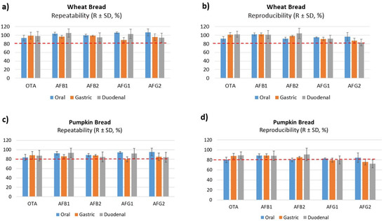 Accuracy (repeatability and reproducibility) data obtained with digested of wheat bread (a,b) and pumpkin bread (c,d) at 5 µg/kg (level L2).