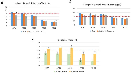 The matrix suppression/enhancement effect (ME) was expressed as >0% and <0% indicating matrix suppression and enhancement, respectively. Results within ± 10% were classified as not influenced by the matrix (presented with two black dashed lines in the Figure 3). MEs in digested wheat bread ranged from 22% to 6.4% in the oral phase, 21.1% to 5.9% in the gastric phase and 16.6% to 6.2% in the duodenal phase. However, in digested pumpkin bread the MEs were highest with values ranging from 29 to 15.9% in the oral phase, 27.5 to 14.8% in the gastric phase, and 23.5 to 15.1% in the duodenal phase (Figure 3a,b). AFB1 and AFB2 presented the highest MEs in digested pumpkin bread, in the duodenal phase (Figure 3c), however, OTA presented higher values of ME than both mycotoxins in the oral and gastric phase. It was observed that during the enzymatic activity, the matrix is less extracted in wheat bread. On average, all the mycotoxins signals were suppressed by the co-eluting matrix. In the literature, none of the consulted articles included and/or evaluate the matrix effect of the different phases in the analytical method. In fact, Massarolo et al. [20] indicate how to evaluate the ME of cornmeal in AFs analysis in this food matrix according to a previous validation, however, neither values are collected for digested phases.