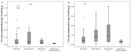 CTX-like toxicity in flesh (A) and liver (B) by CBA (ng CTX1B Eq·(g tissue)−1) according to fish species. The plot represents the interquartile range (Q3–Q1), and dark line represents the median values. Asterisks (*) indicate outliers and the numbers correspond to specific individuals (Table S1).