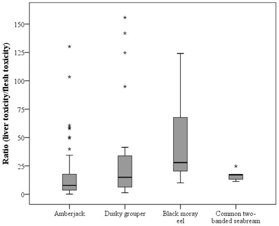 Liver versus flesh CTX concentration ratio according to fish species evaluated by CBA. The plot represents the interquartile range (Q3–Q1), and dark line represents the median values. Asterisks (*) indicate outliers.