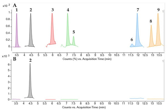 LC-MS/MS chromatogram monitoring CTXs [M + Na]+ as precursor and product ion of: (A) Reference material of CTXs: CTX1B (1), C-CTX1 (2), C-CTX1-Me (3), 52-epi-54-deoxyCTX1B (4), 54-deoxyCTX1B (5), 49-epiCTX3C (6), CTX3C (7), CTX4A (8), and CTX4B (9); (B) C-CTX1 (2) detected in an amberjack.
