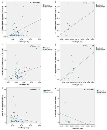 A positive correlation was observed between liver toxicity level and weight (r = 0.266, p = 0.044) and length (r = 0.829, p = 0.042) (Figure 4C,D). Likewise, a positive correlation was found between flesh toxicity and weight (r = 0.321, p = 0.016) (Figure 4A).