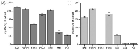 Extraction yield of seven extracts was calculated and are listed in Table S1. Based on the standard curves of gallic acid (y = 0.0001x + 0.236; R2 = 0.995) and rutin (0.0002x + 0.126; R2 = 0.992), TPC and TFC were estimated for 1mg of seven extracts in terms of gallic acid and rutin gram equivalents (GAE and RTE). CAE, PGRPE, and PGAE extracts contained more total phenols and flavonoids than the other extracts (Figure 1).