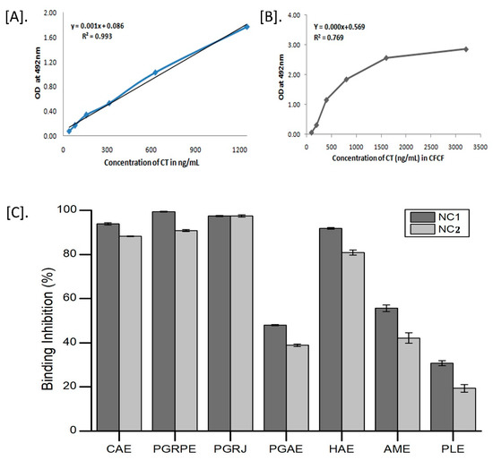 Determination of CT concentration in CFCF and its binding inhibition to GM1. (A) Standard graph of CT; (B) Absorbance curve of CT in CFCF; (C) Binding inhibition percentage (BI%) of CT to GM1 in presence of seven extracts using GM1 ELISA.