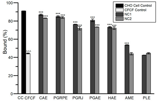 Cyclic AMP levels were decreased significantly (*** p < 0.001) for CAE, PGRPE, PGRJ, PGAE and HAE at both NC1 and NC2 except for AME when compared to CFCF control. Among the seven extracts, PLE showed no activity against elevated cAMP levels in CHO cells (Figure 4).