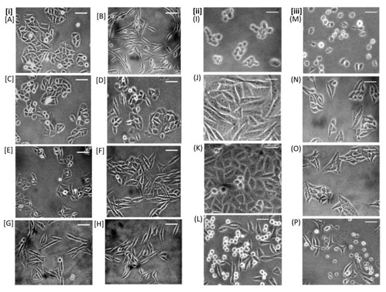 Protective activity of seven extracts (NC1) against morphological alterations. (i) CHO cell control (A), CHO cells treated with CFCF TCID100 for cell elongation (CFCE:64-fold dilution of CFCF) (B), CAE + CFCE (C), PGAE + CFCE (D), PGRPE + CFCE (E), PGRJ + CFCE (F), HAE + CFCE (G), AME + CFCE (H). (ii) CHO cell control treated with CFCF TCID100 for cell rounding (CFCR:8-fold dilution of CFCF) (I), CAE + CFCR (J), PGRPE + CFCR (K), PGAE + CFCR (L). (iii) CHO cells control treated with CFCF TCID100 for cell death (CFCD: 2-fold dilution of CFCF) (M), CAE + CFCD (N), PGRPE + CFCD (O), PGAE + CFCD (P) using phase contrast microscopy at 40× magnification (scale bar-5 µm).