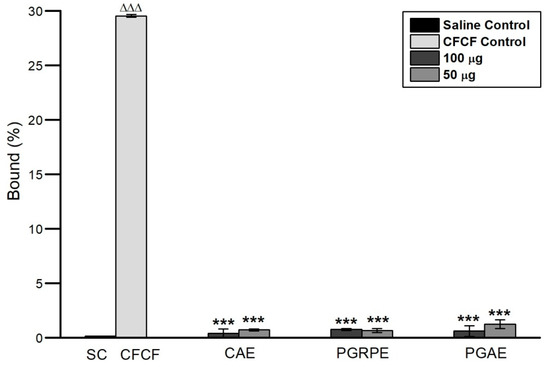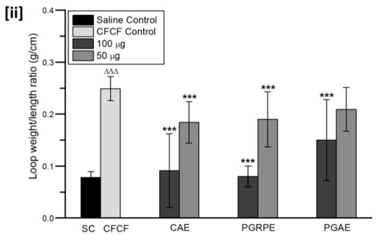 Based on the in vitro findings, two concentrations (100 µg and 50 µg/loop) of three extracts CAE, PGRPE, and PGAE against CFCF containing 1 µg of CT were chosen for further in vivo testing. The mean weight/length ratio of CFCF treated ileal loops was 0.249 g/cm ± 0.02 while that of untreated saline instilled ileal loops was 0.078 g/cm ± 0.01. It was discovered that mice ileal loops treated with CFCF containing 1 µg of CT caused significant intestinal fluid accumulation after 18 h of incubation (ΔΔΔ p < 0.001) when compared to the Saline control group. CAE and PGRPE at both concentrations resulted in a significant reduction in intestinal fluid accumulation in all test groups (*** p < 0.001) when compared to the CFCF control group (Figure 6). Table S2 shows the mean W/L ratios of the control and test groups.