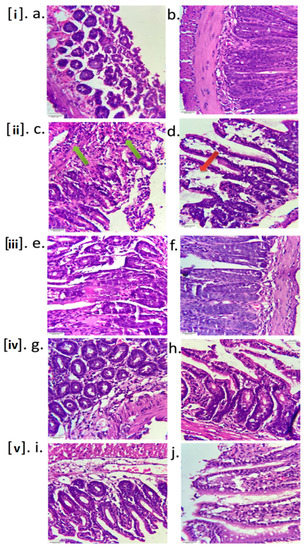 Histopathological analysis of mice ileal loops. Intestinal tissues of mice ileal sections were stained with hematoxylin and eosin and observed at 40× magnification (scale bar = 30 µm). Inflammation in submucosa represented in green arrows (ii(c)) and mucosal layer degeneration, diffused edema represented in red arrows (ii(d)). (i(a,b)) Saline control; (ii(c,d)) CFCF control (CT = 1 µg); (iii(e,f)) CAE (100 µg) + CFCF (CT = 1 µg); (iv(g,h)) PGRPE(100 µg) + CFCF(CT = 1 µg); (v(i,j)) PGAE(100 µg) + CFCF (CT = 1 µg).