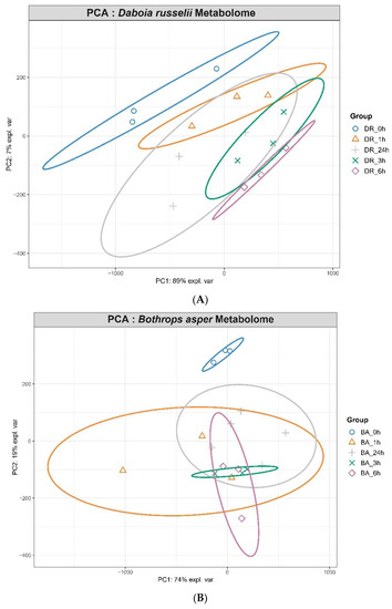 The molecular signatures of samples obtained 24 h after injection of venoms were more similar to the control, whereas a higher level of perturbation was observed in samples collected at 1, 3 and 6 h post venom injection, thus indicating that the metabolic perturbations were returning to baseline level at 24 h. The PCA plots shown in Figure 2A,B indicate that samples from D. russelii-injected mice showed 89% explained variance on PC1 while those from B. asper-injected mice showed 74%. PCA score plots show that samples from the same treatments clustered together. A clear separation was observed for both venoms between values in control samples from non-envenomed mice and samples from envenomed mice at the four time intervals, hence evidencing an effect of the venoms on the metabolomic profile of mice at all time intervals evaluated.