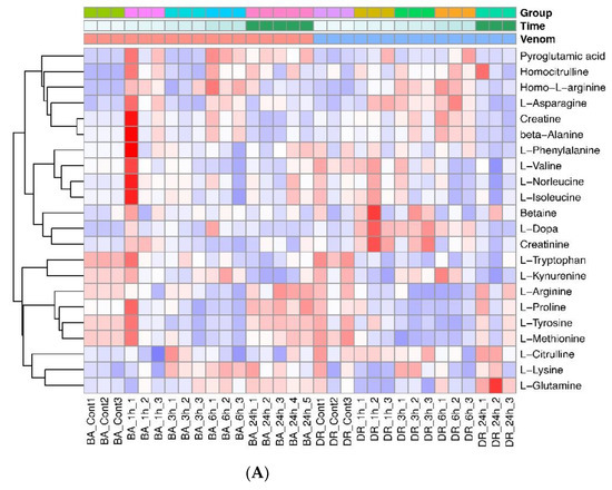 As shown in Figure 2C,D, the biosynthetic pathways of several amino acids were perturbed by both venoms along with purine and pyrimidine metabolism. We analyzed the enrichment of the KEGG (Kyoto Encyclopedia of Genes and Genomes) metabolic pathways which showed the highest differences between samples from venom-injected mice and those of non-envenomed mice. The main altered pathways corresponded to aminoacyl-tRNA biosynthesis, tryptophan metabolism, phenylalanine, tyrosine and tryptophan biosynthesis, and D-glutamine and D-glutamate metabolism (in the case of samples from D. russelii-injected mice), and to aminoacyl-tRNA biosynthesis, pyrimidine metabolism, pantothenate and CoA biosynthesis, arginine biosynthesis, vitamin B6 metabolism, phenylalanine, tyrosine and tryptophane biosynthesis, phenylalanine metabolism (in the case of samples from B. asper -injected mice). The heat map of the top dysregulated metabolites revealed similarities and differences in the metabolite changes induced by these venoms in plasma (Supplemmentary Figure S1).