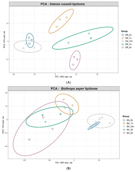 We also explored the dynamic changes in the global pattern of circulating lipids in the plasma of envenomed mice. The data for multivariate statistical analysis was set as an X-matrix consisting of 32 rows from both B. asper and D. russelii-injected animals, whereas the Y-matrix represented the 822 metabolites lipid species of various lipid classes. A PCA model was then created to evaluate the distinction of the lipid species level and to identify the relationships between lipidome (matrix X) and changes in the circulating lipid species (matrix Y). Lipids were first analyzed by PCA to visualize the overall distribution of samples. As shown in Figure 6A,B, there is distinct separation between the sampling time points when the data is subjected to unsupervised PCA clustering. For D. russelii, there is 48% variance on PC1 while the PC2 showed 13% variance. Similarly, for B. asper, PC1 showed 38% variance while PC2 showed 12% variance. In both of these PCA plots, the time 0 samples (obtained from non-envenomed mice) clustered well with the 24 h samples, while other time points are distinctly separated from the control non-envenomed samples. This shows that the maximal variation in the lipidome is captured in samples from 1, 3 and 6 h. To identify the dysregulated lipid species, we then performed pairwise log2fold change calculation comparing every other timepoint with control samples. Finally, to discern highly significant lipid species, we performed one way ANOVA on samples from each treatment to identify lipid species that showed significant changes at p-value ≤ 0.01. By using these lipid species from each venom treatment, we created a heatmap of highly dysregulated lipid species (Supplementary Figure S2). We observed that most of the TG levels were increased, especially at 3 and 6 h, and returned to baseline at 24 h. In contrast, phospholipids such as PC and PE showed an opposite trend since they decreased at 1, 3 and 6 h, returning to basal levels at 24 h.