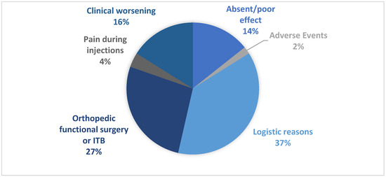 Botulinum toxin type A (BoNT-A) is a well-established treatment for treating focal spasticity in the upper motor neuron syndrome [14]. Over the past 30 years, accumulated evidence has established the effectiveness of BoNT-A [11,15,16,17]. BoNT-A plays also a role in the management of other conditions, such as chronic migraine, focal dystonia, hemifacial spasm, myofascial pain, and cerebral palsy [18,19,20,21]. Despite the considerable and well-known beneficial effects, many patients suffering from spasticity discontinue treatment. Consequently, there is a lack of knowledge about BoNT-A discontinuation and its determinants in daily clinical practice.