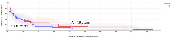 The overall survival of patients who discontinued BoNT-A treatment, spasticity duration. A > 10 years, B < 10 years.