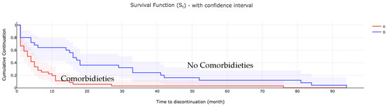 The overall survival of patients who discontinued BoNT-A treatment, comorbidities. A: comorbidities, B no comorbidities.