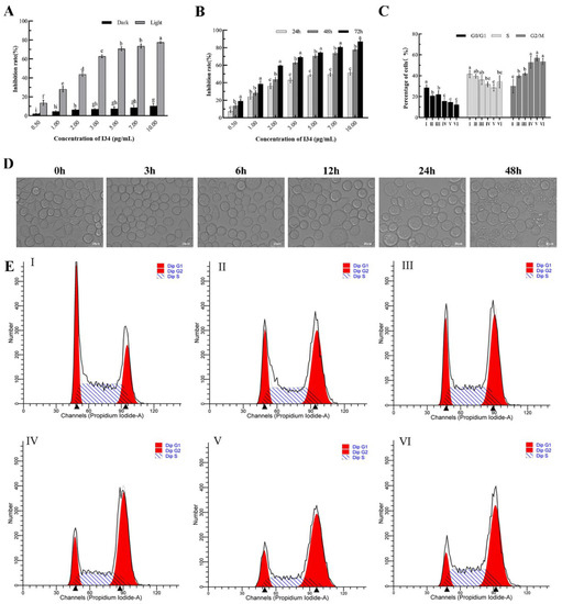 Figure 2C,E, the treated cells significantly decreased the percentage of cells in the G1/G0 phase compared with 0 h, while the number of cells in the G2/M phase increased significantly. Among them, the number of cells in the G0/G1 phase proportion decreased from 28.49% to 12.27% after 48 h, while the number of cells in the G2/M phase proportion increased from 29.87% to 53.53%. These data indicated that photoactivated I34 regulated Sf9 cell proliferation by inducing cell cycle arrest in the G2/M phase. The cell cycle was the main regulatory mechanism that controlled cell growth. The cells were always in a continuous cell cycle from G1, S, G2 to M phase due to the continuous proliferation of normal cells [