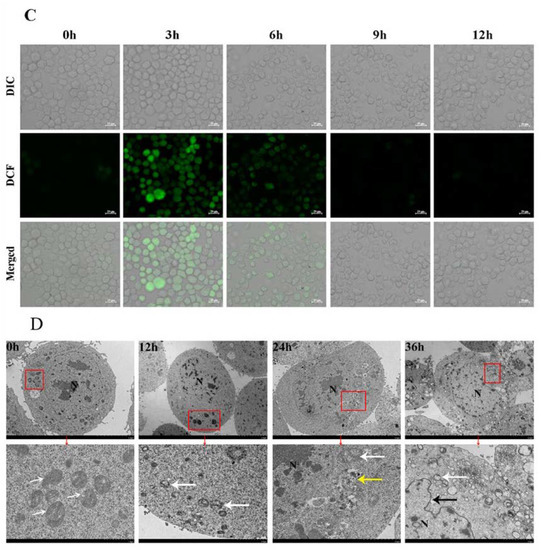Figure 3C), and the ROS level was found to be the highest within 3 h, which was consistent with the results using flow cytometry. ROS are chemically active molecules produced by a reduction in molecular oxygen, including some oxygen-containing free radicals, peroxides, singlet oxygen molecules, and so on [